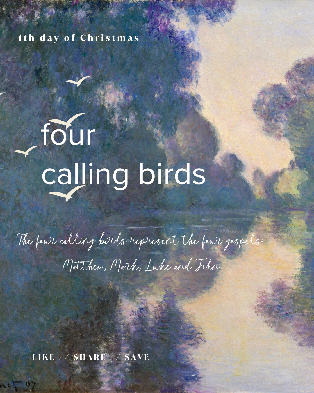 The four calling birds represent the four gospels: Matthew, Mark, Luke and John.