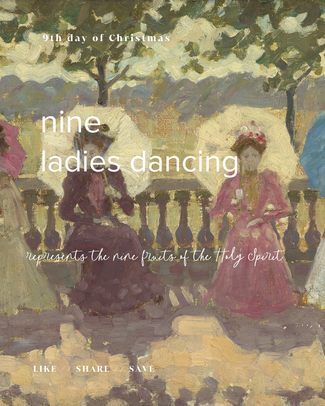 The nine ladies dancing symbolize the fruit of the Spirit. What grace that we don’t have be the ones who make this fruit grow. The work of the Spirit is one we can rest in. In another passage we also find that the Holy Spirit is interceding for us in ways we won’t understand this side of heaven. ⠀⠀